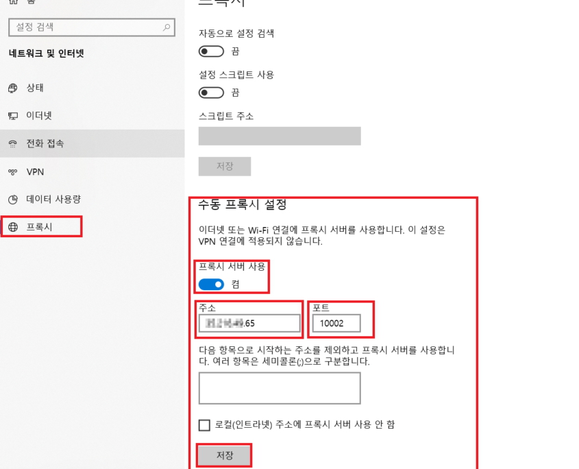 설정 – 네트워크 및 인터넷 – 프록시 – 수동프록시설정 에서 아이피를 넣어주고 저장 해줍니다.